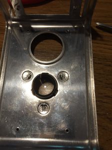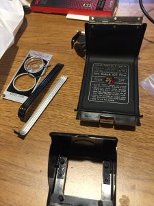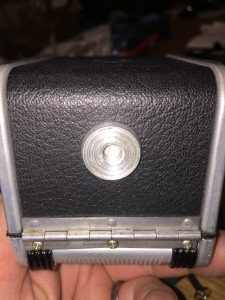 Inside the camera, there is a black metal liner, probably a reel for the last roll of film used at the bottom, and a film take-up reel at the top. I only needed the part of the metal liner with the holes for the 2 top back viewfinder screws, so I used a Dremel to cut off the part I didn’t need.