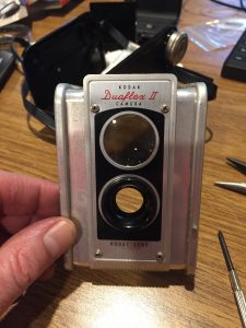I kind of expected I’d strike out and end up buying something on eBay, but there were a lot of old film cameras there. Old Kodak Brownies were abundant and cheap, but they didn’t have the right look. Old Polaroids with the extendable lens and bellows practically screamed “I’m a camera!” and looked great, but they were too big for what I had in mind. There were a few really nice TLR (twin lens reflex) cameras with adjustable focus, shutter speed, and aperture but they were more expensive than I was looking for. And I would have felt slightly guilty cutting up a camera that could still take nice pictures for someone with the patience for film.